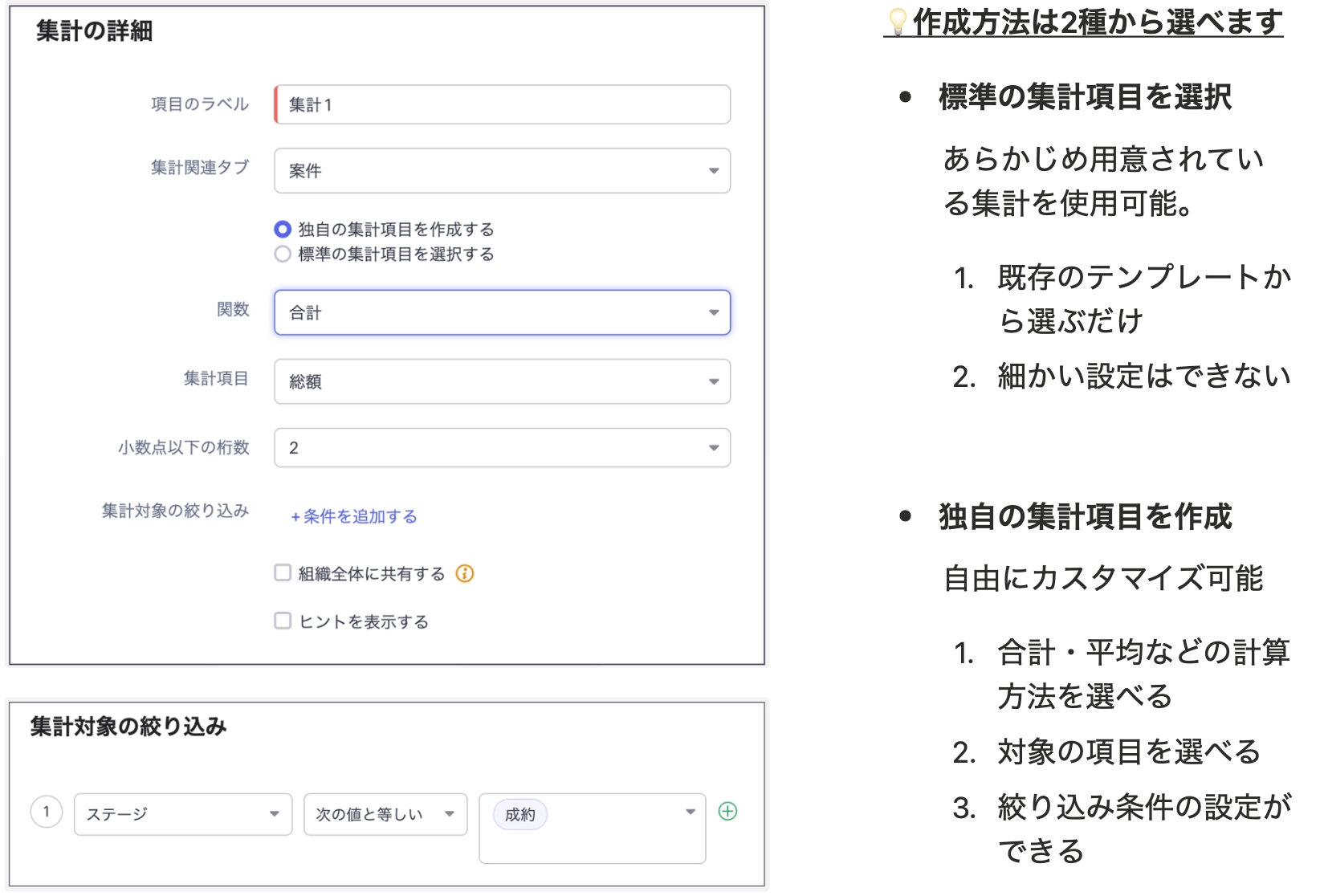 例えば、「取引先Aの案件の合計金額」などを自動計算で算出できます。