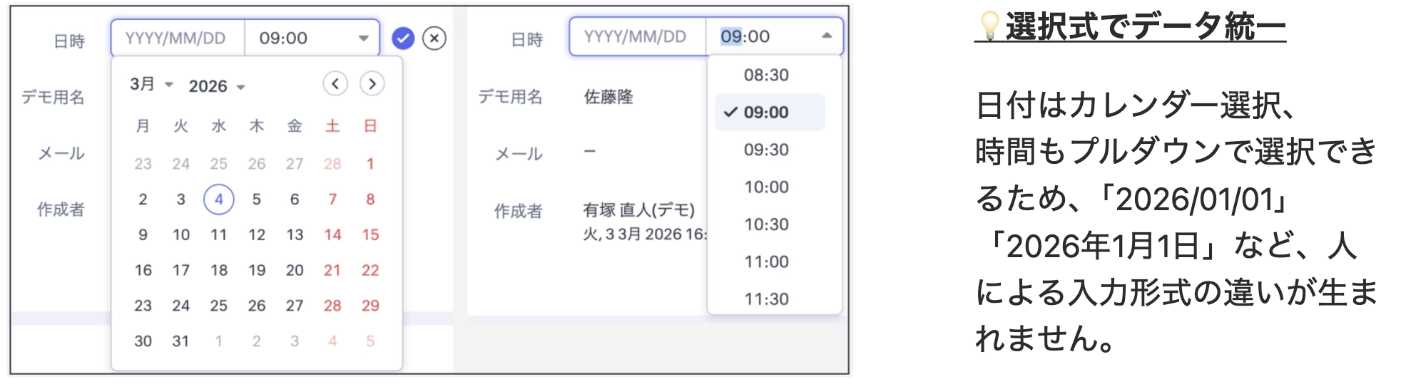自由記述のように入力にばらつきが出ないため、データを統一でき、分析にも強い項目です。