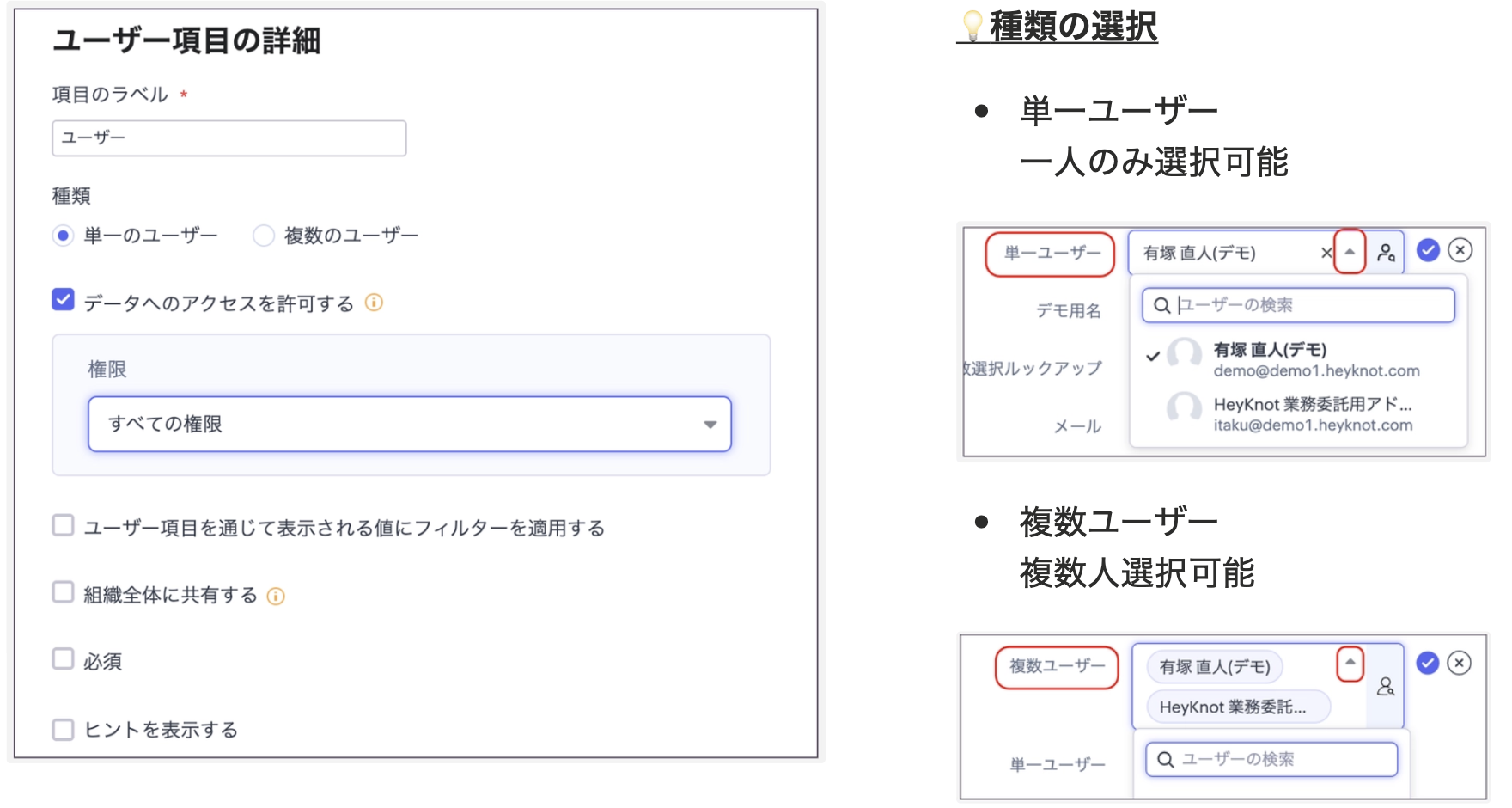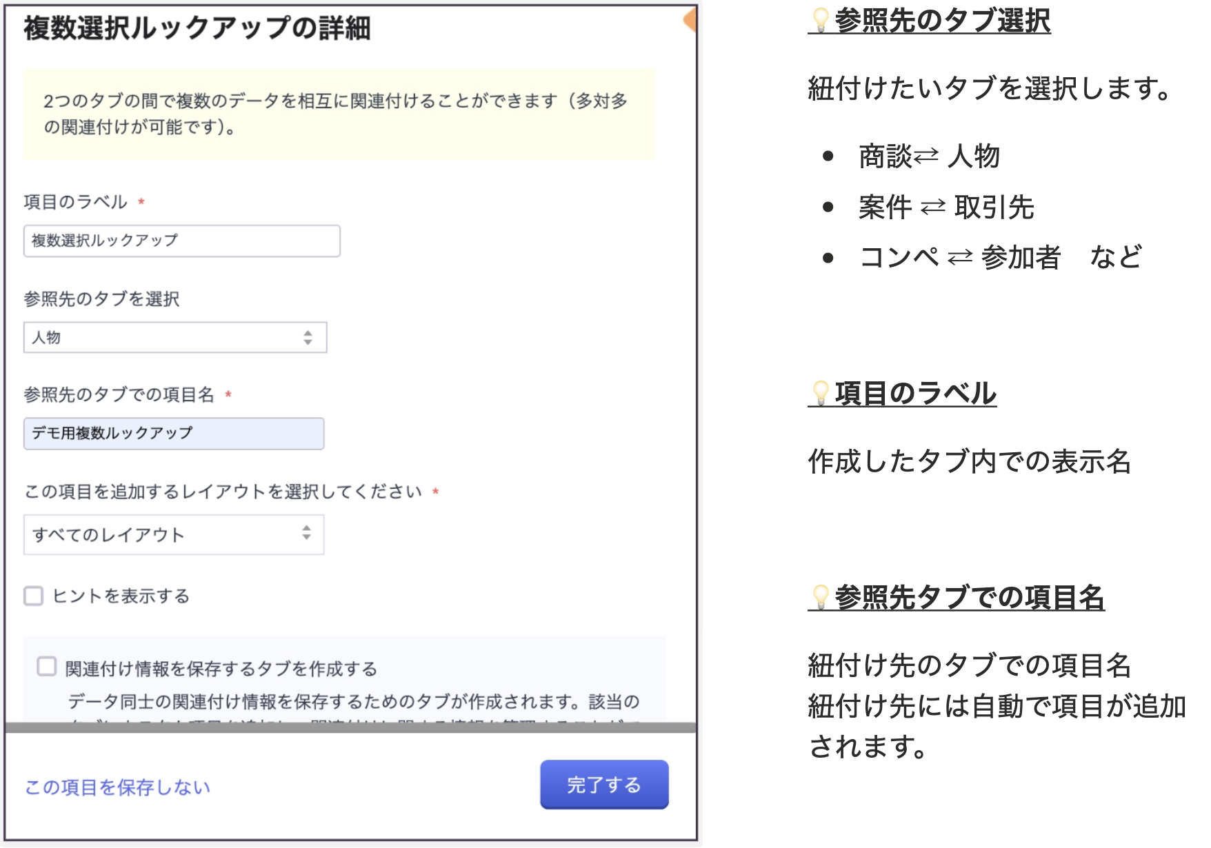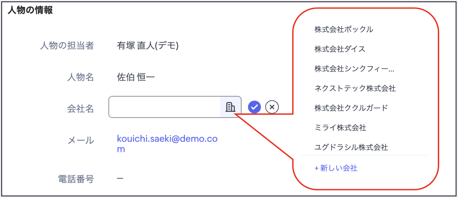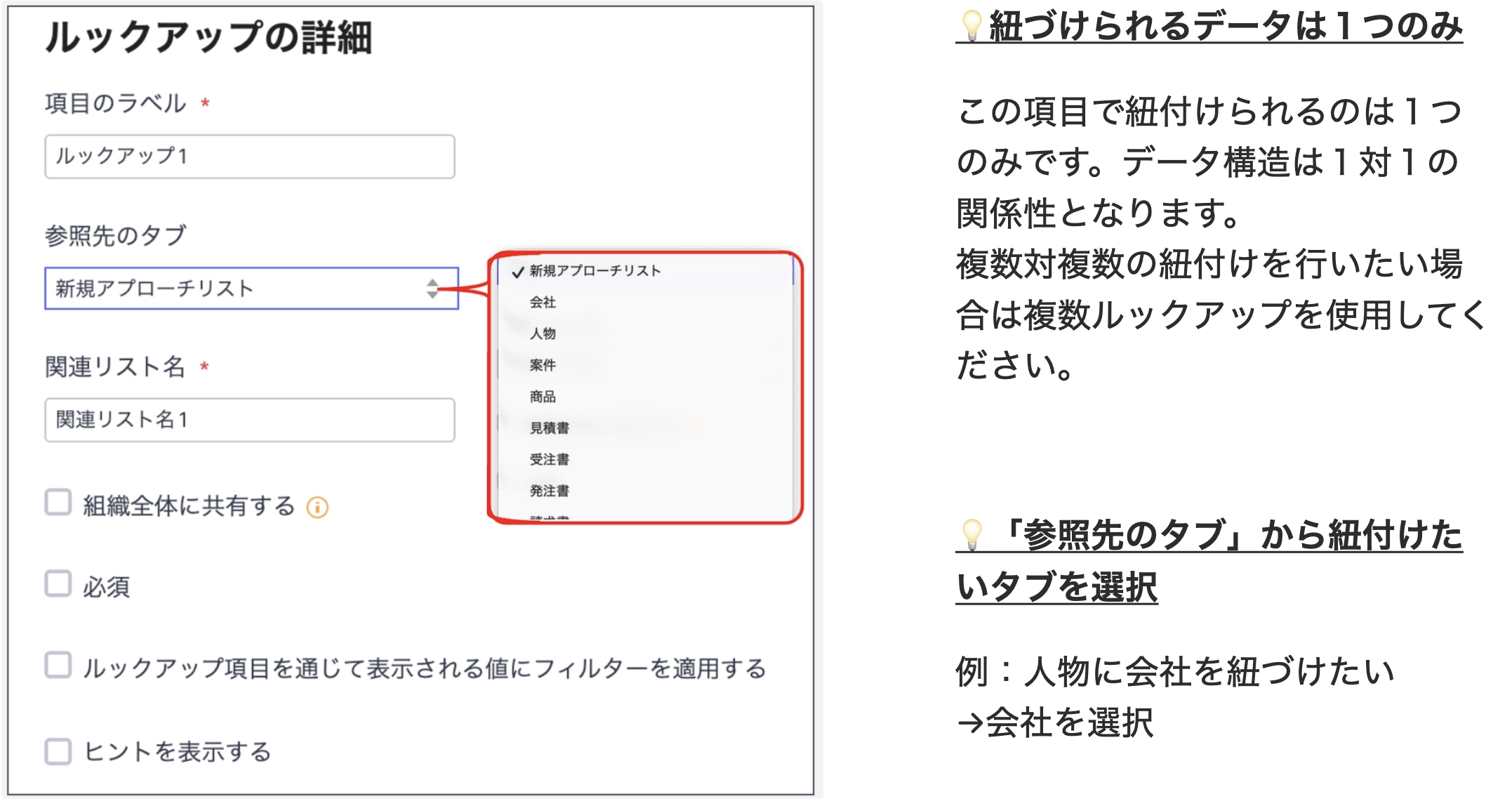 例えば、「人物タブ」で「取引先タブ」のルックアップ項目を作成した場合、「Aさんはどの会社の社員か」という情報を、プルダウンで紐づけることができます。