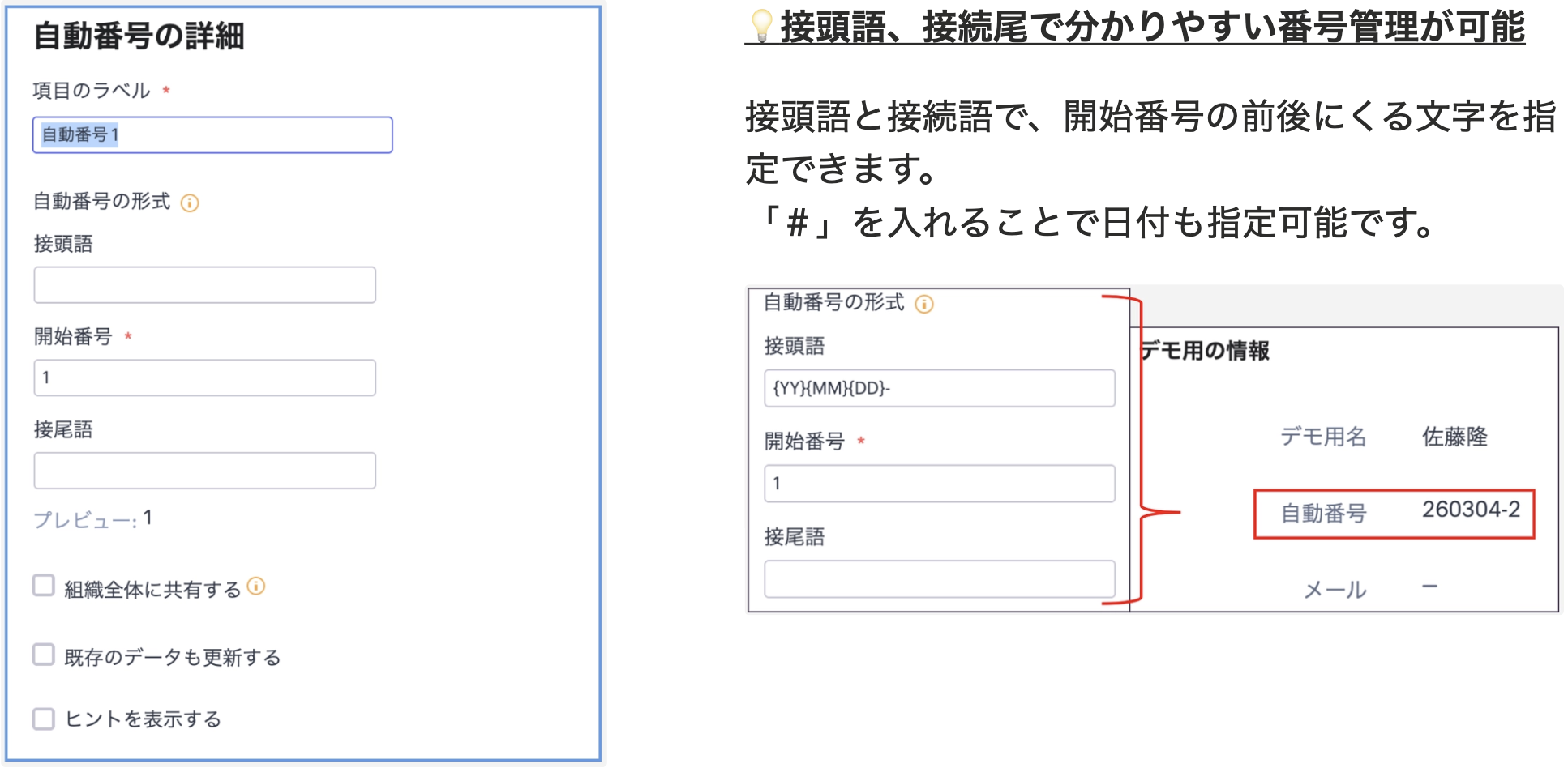 接頭語や開始番号、桁数も設定できます。案件番号や問い合わせの受付番号など、番号を管理するのに適した項目です。