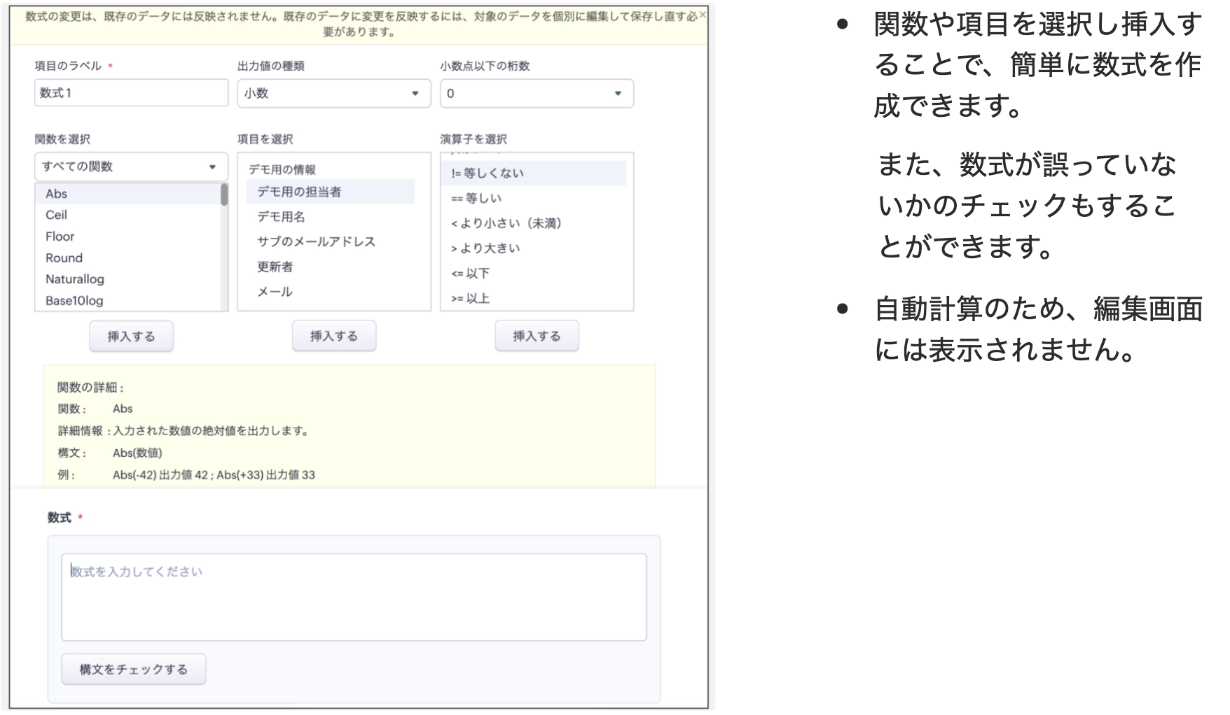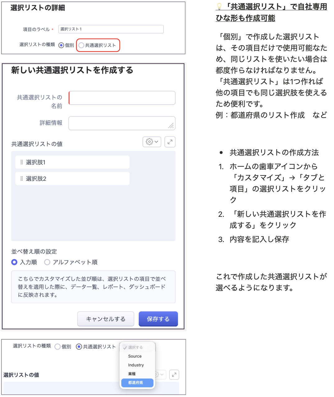 フリーテキスト、日付、数値、選択式、他データとの連携などさまざまな形式があり、活用することで自社仕様にCRMを設計できます。