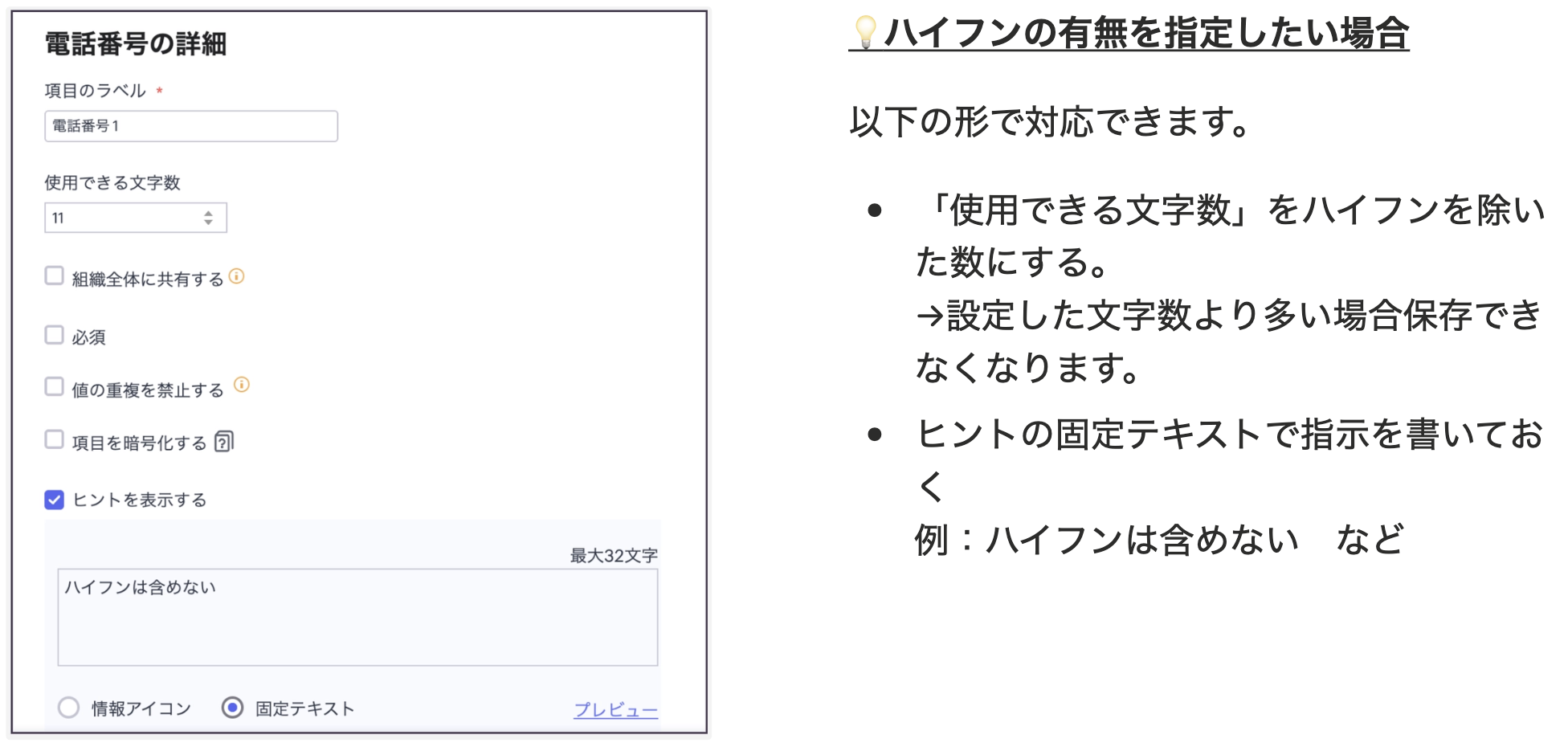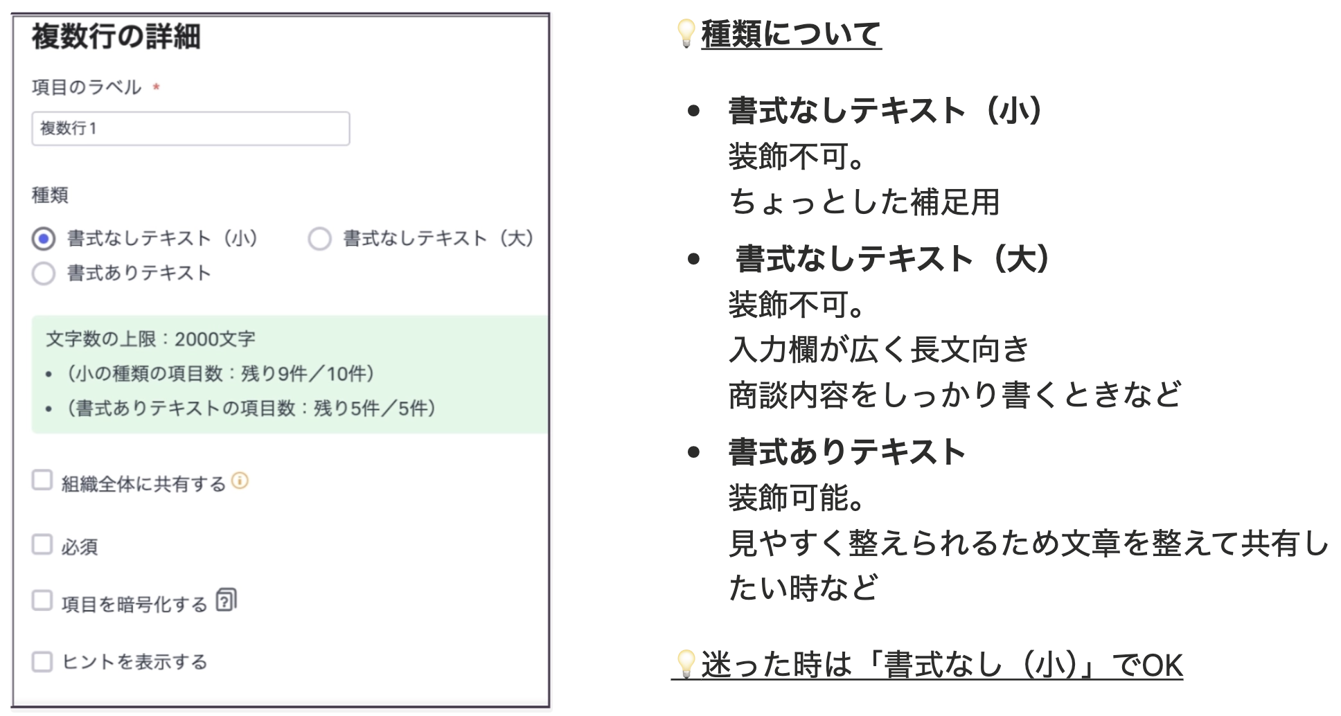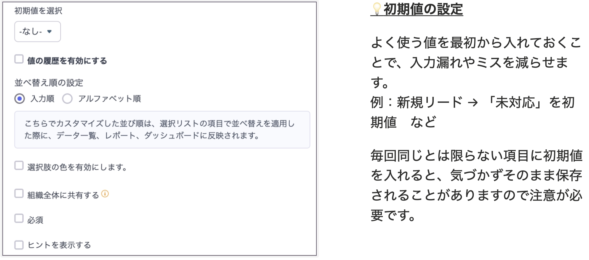 カスタム項目には、テキスト系・数値系・日付系などさまざまな入力形式がありますが、形式にかかわらずよく使われる設定がいくつかあります。 まずは、それらの基本的な設定から押さえていきましょう。