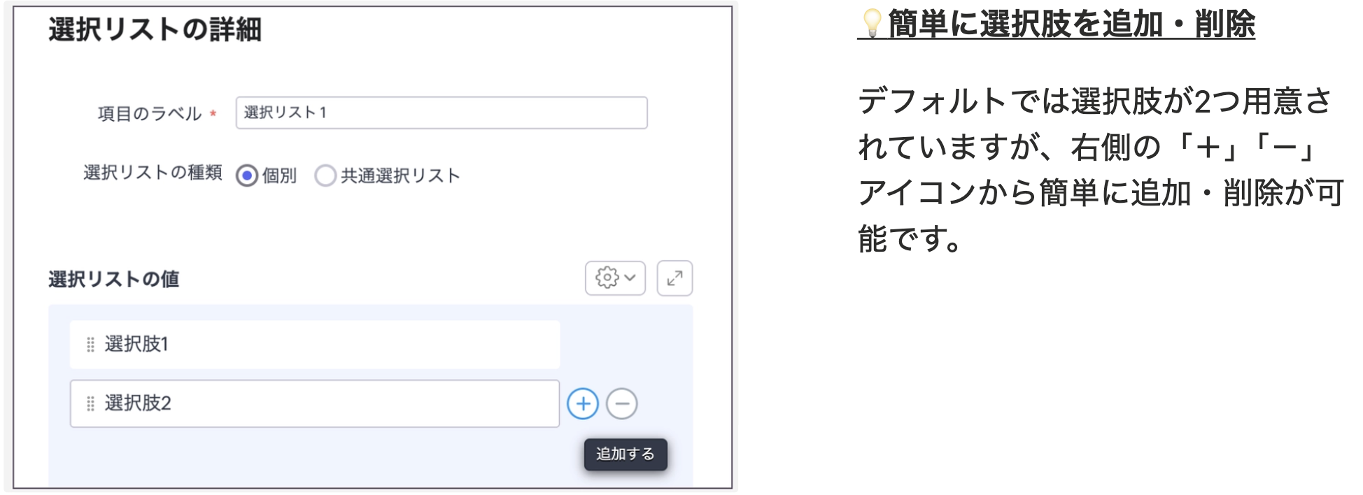 💡基本的に追加・削除ができますが、その項目が下記機能で使用されている場合は、先に関連設定を解除しなければ削除できません。
