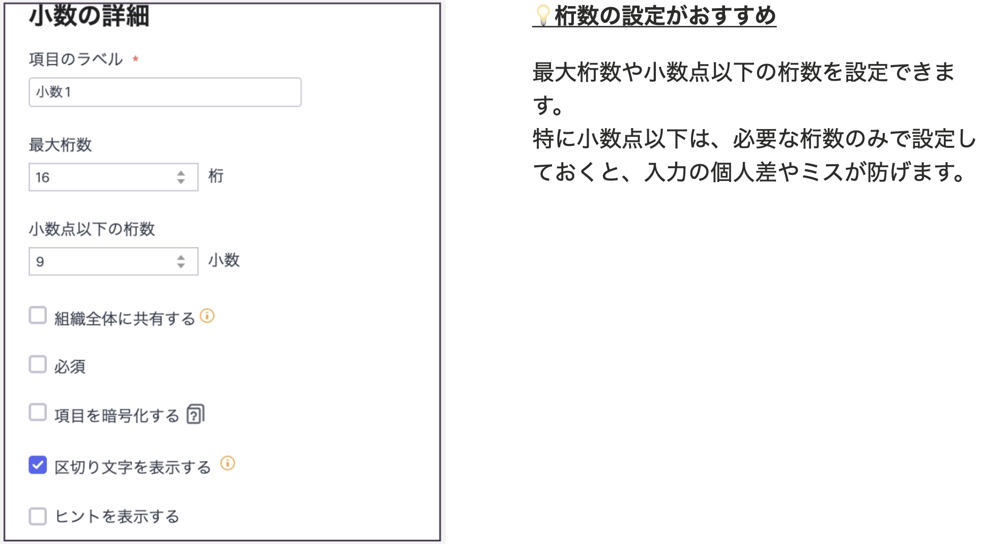 小数点を含む数値入力が可能。 単価や割引率などに向いています。