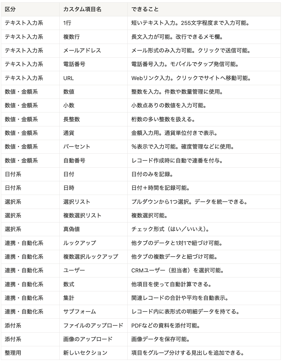 ※カスタム項目の種類はZoho CRMのプランによって増減します。