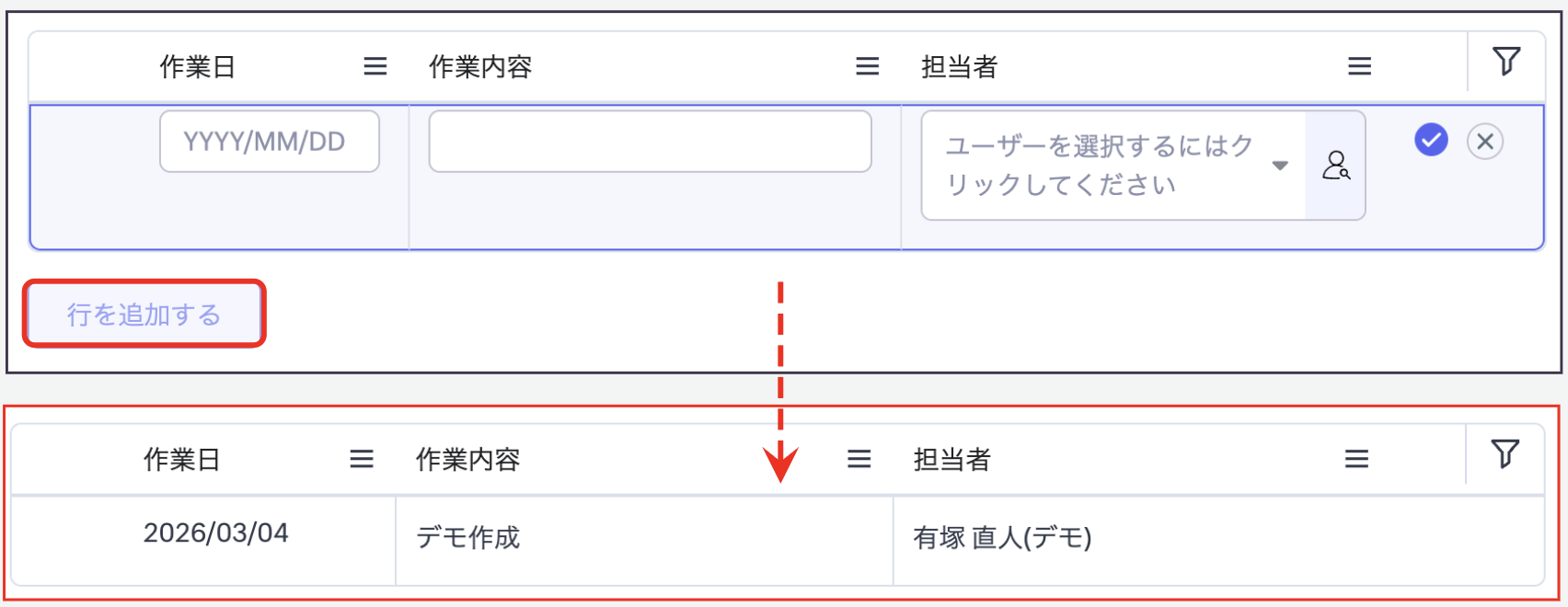 例えば「作業日・作業内容・担当者」といった履歴情報を、1つのレコードの中で一覧表として管理できるようになります。