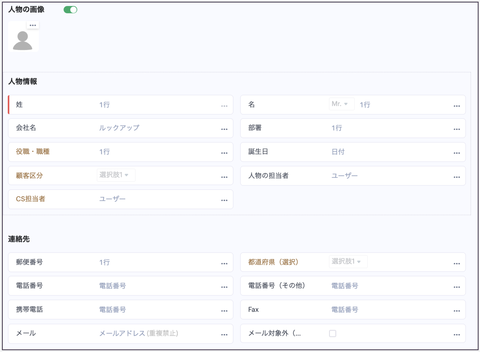 例えば、人物タブの「姓名」のように、業務上欠かせない情報を漏れなく蓄積するためにあらかじめ設定されています。