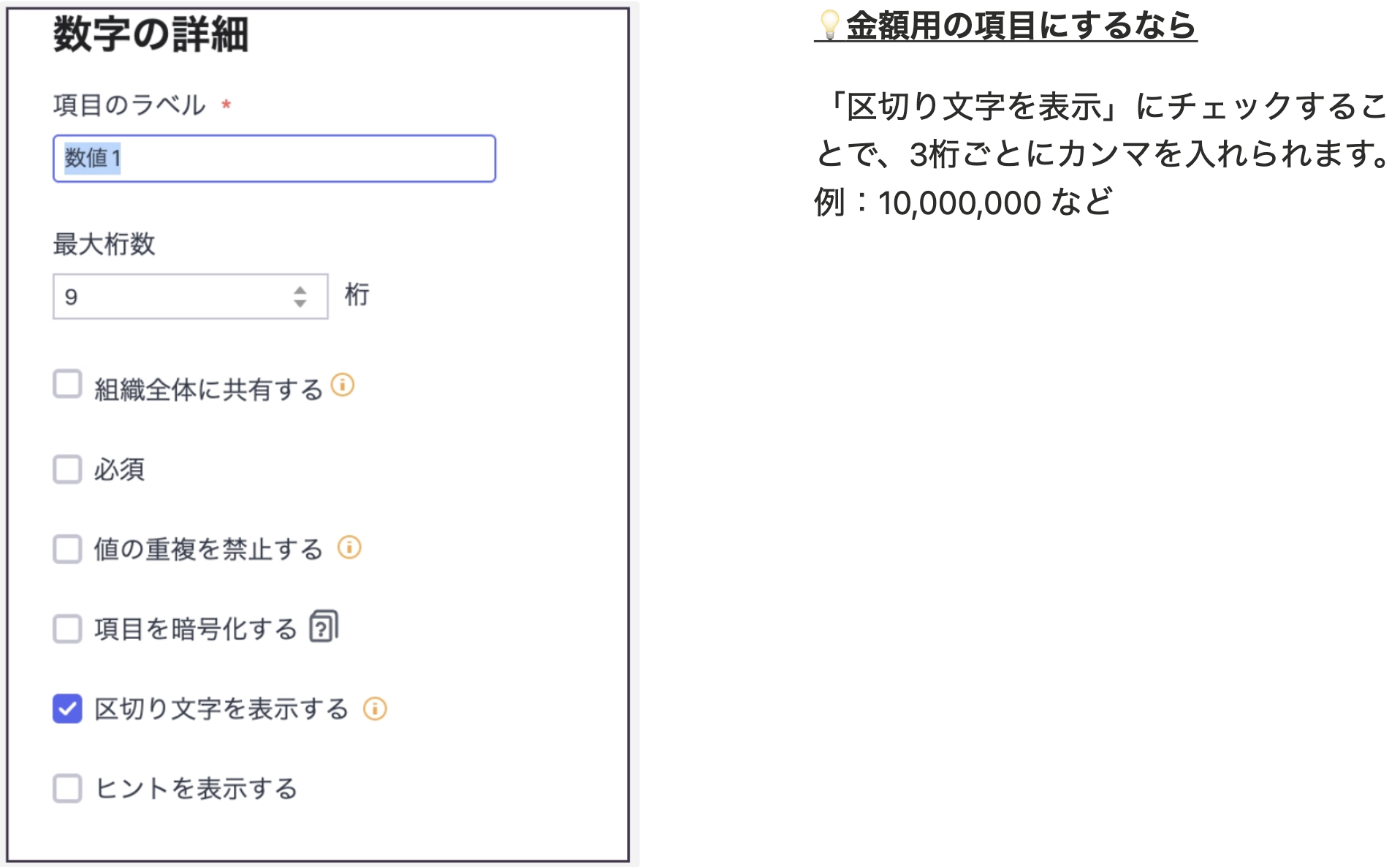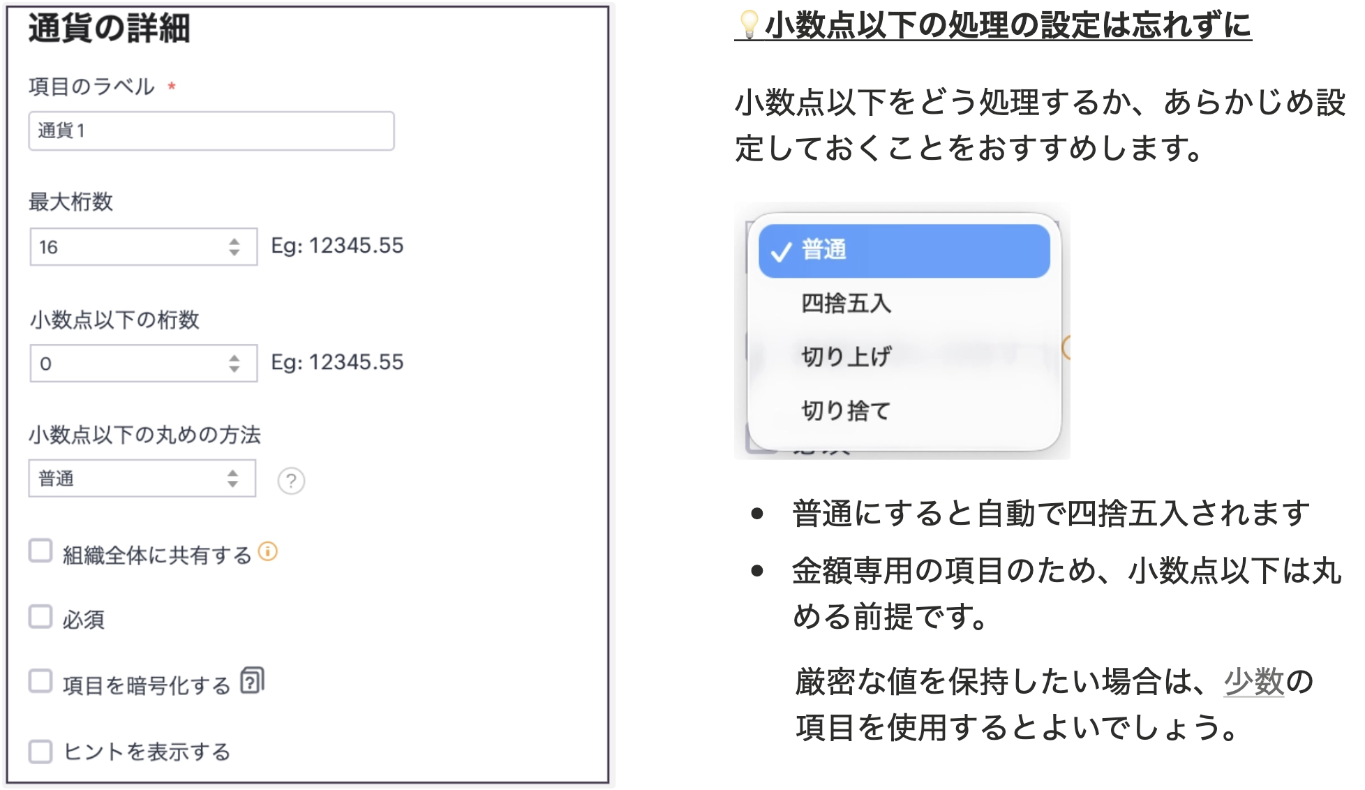 金額専用項目。 通貨単位が付き、レポート集計にも使えます。