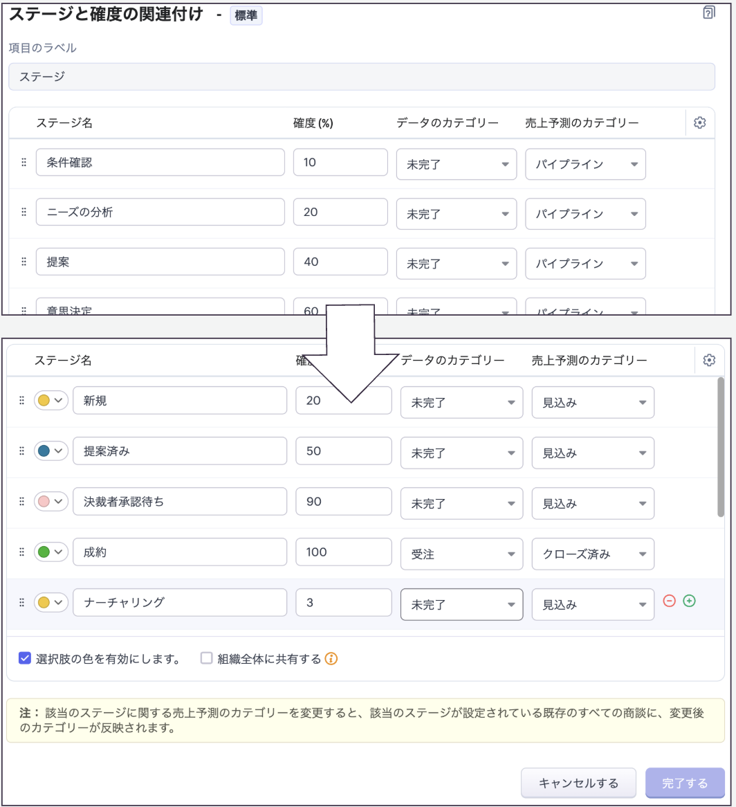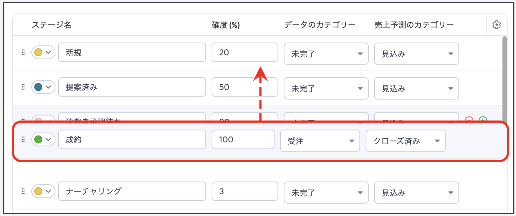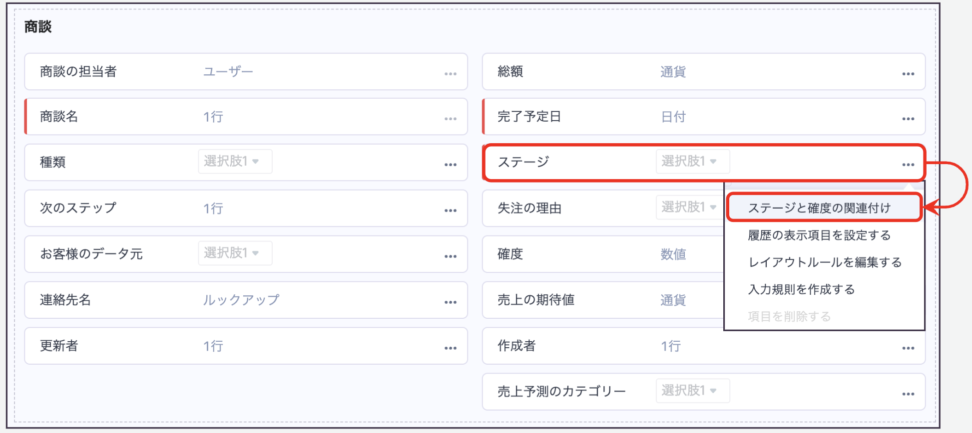 項目右端の「…」から、「ステージと確度の関連付け」をクリックします。