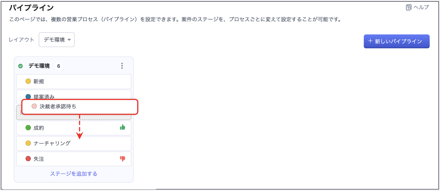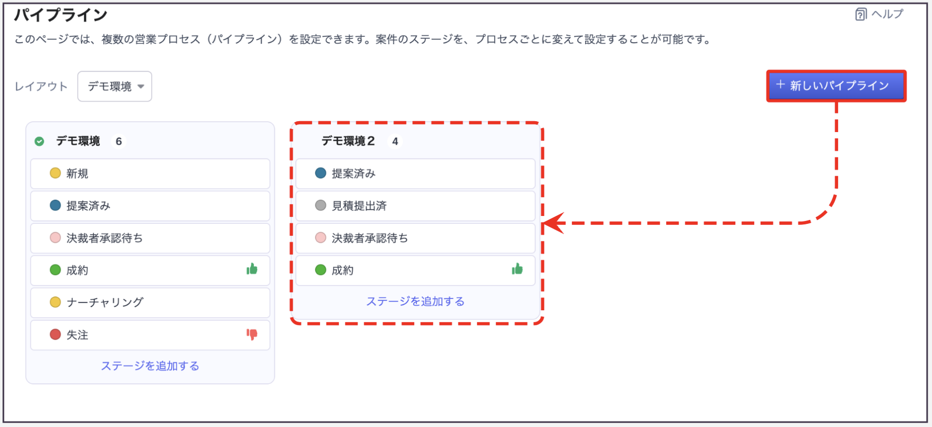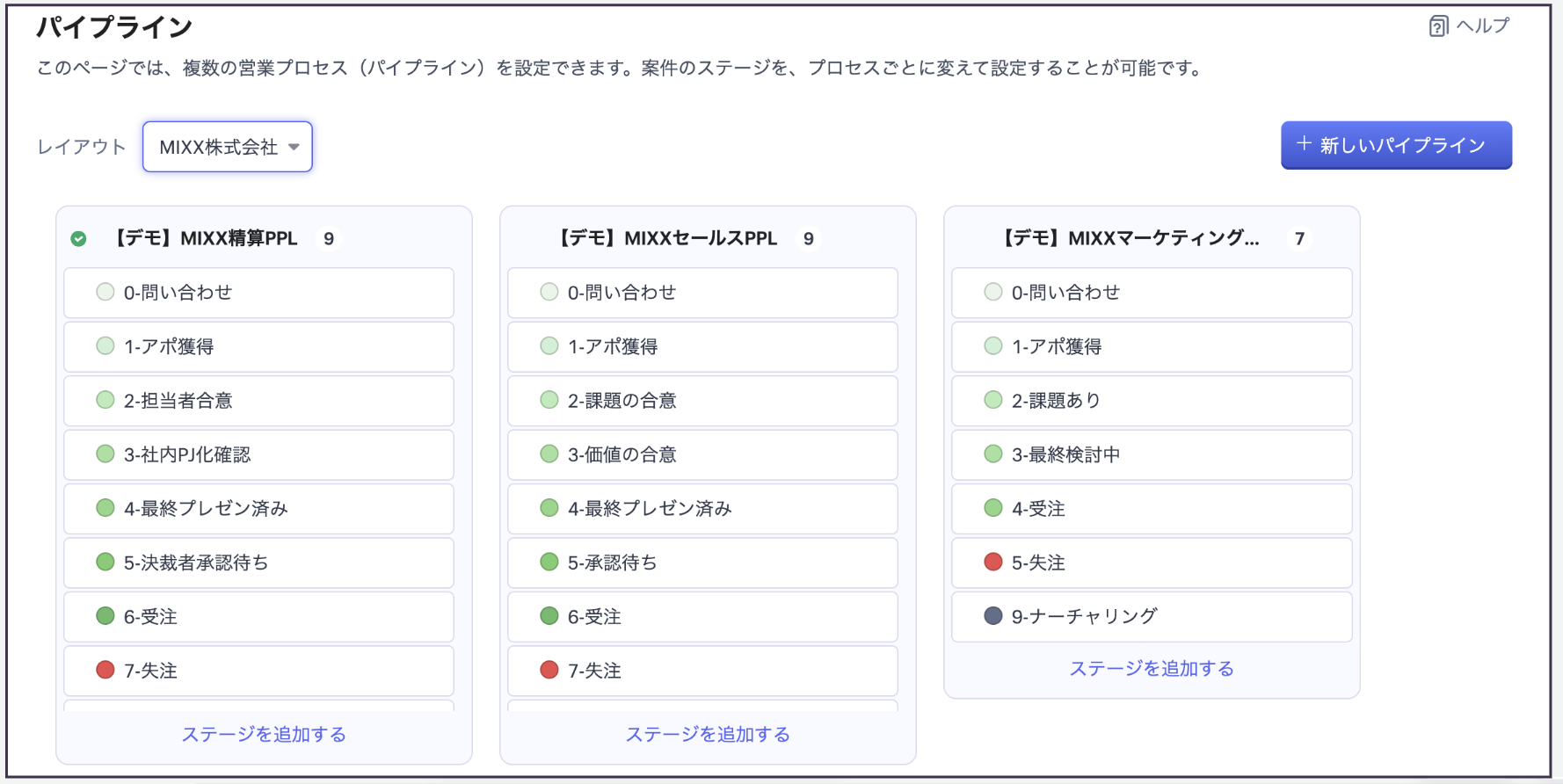 複数のパイプラインで業務や部署ごとに分けることで、プロセスの混在を防ぎ、それぞれに適した形で管理できます。