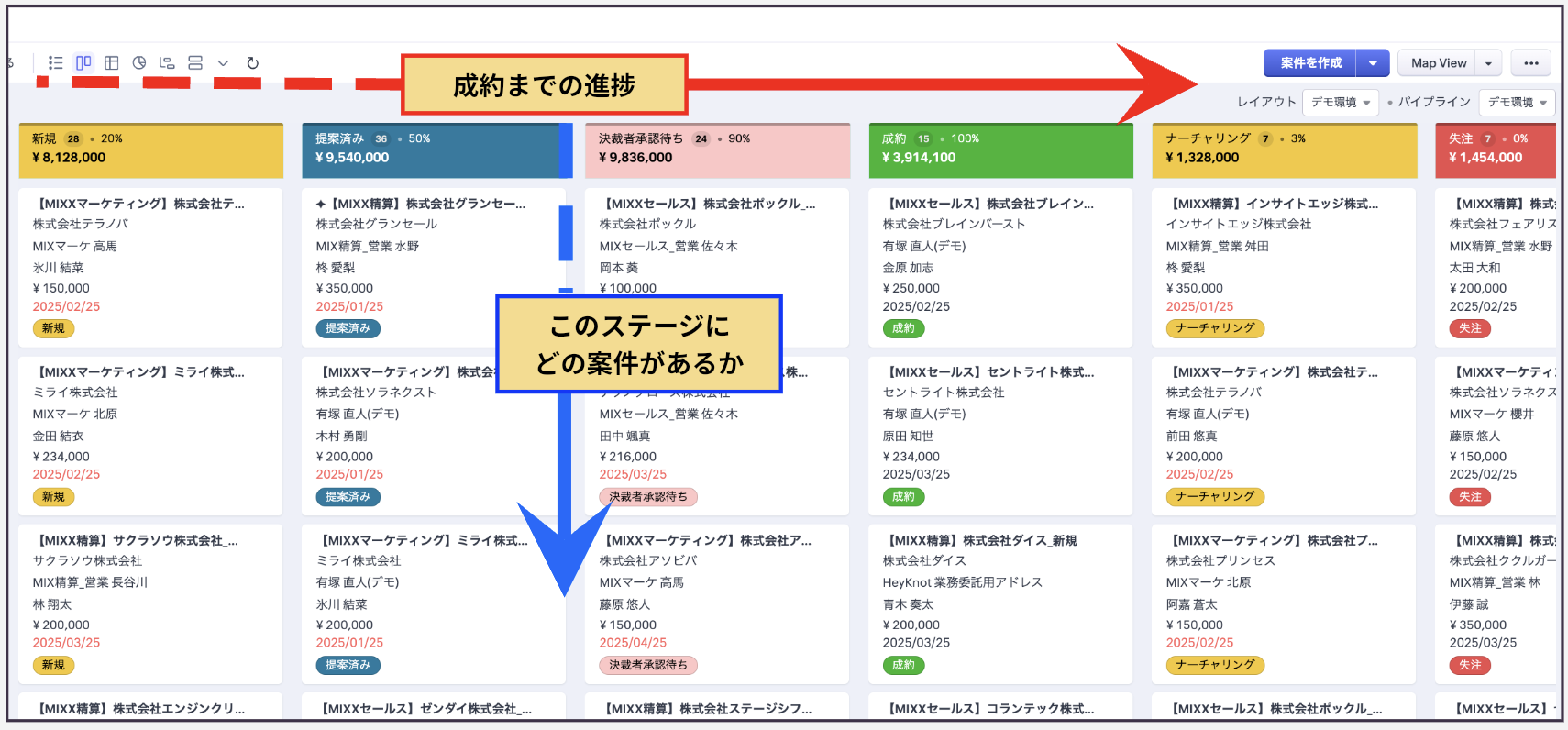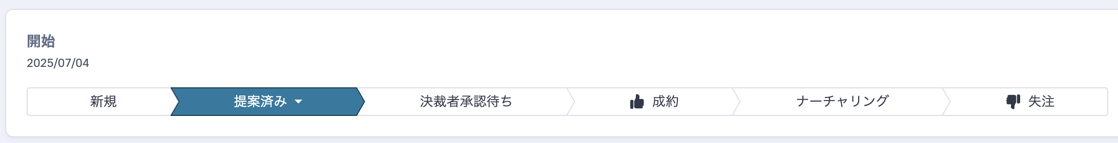 これにより、「この商談は今どこまで進んでいるのか」がひと目で分かる仕組みです。
