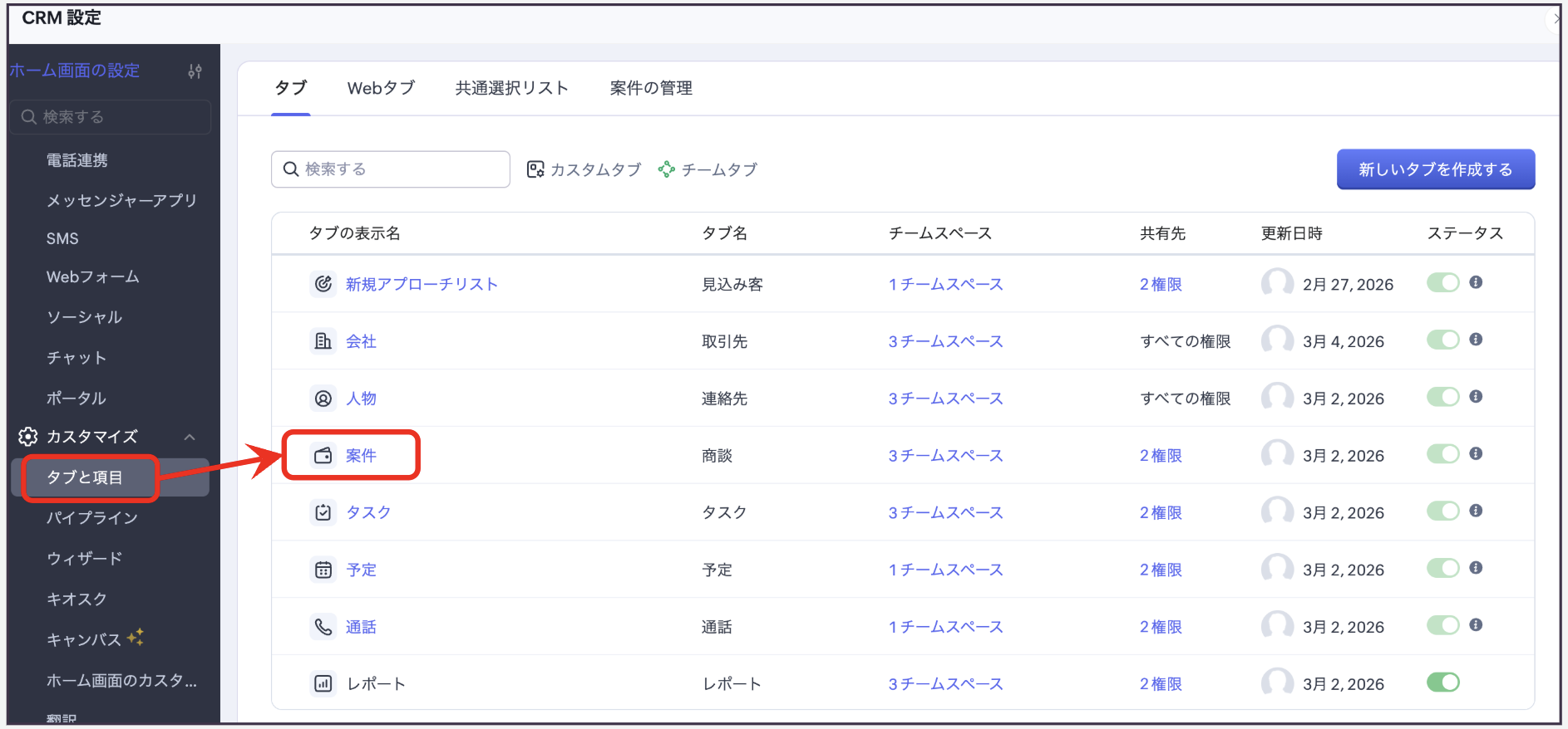 1:ホームの歯車アイコンから、カスタマイズの「タブと項目」→商談タブをクリック