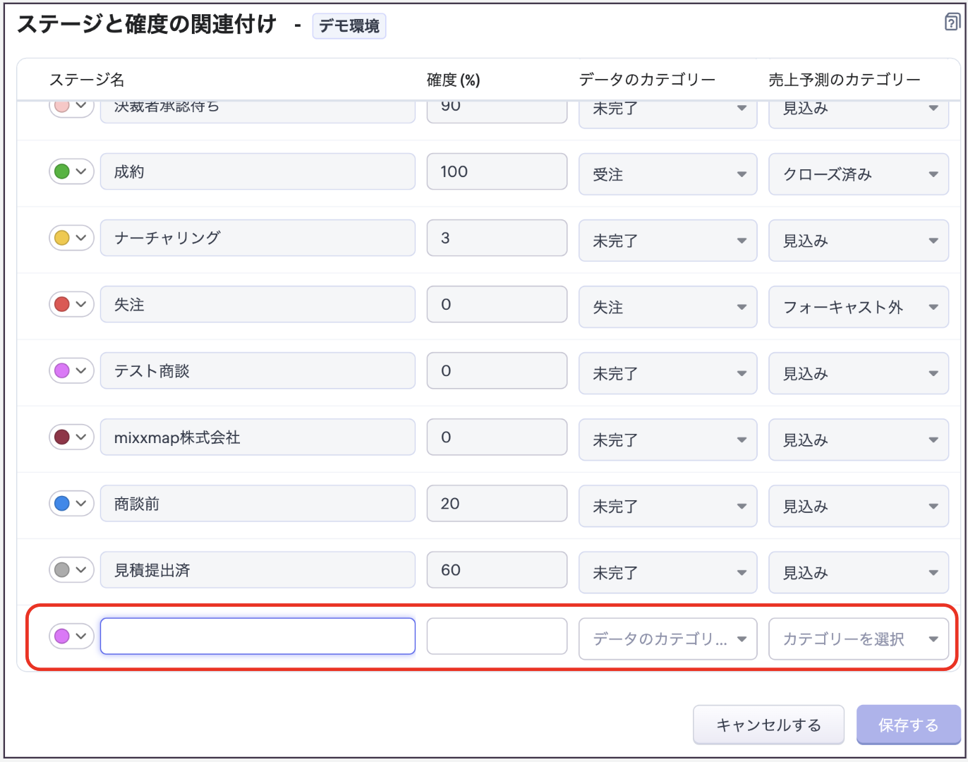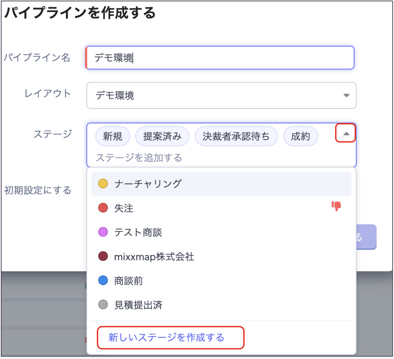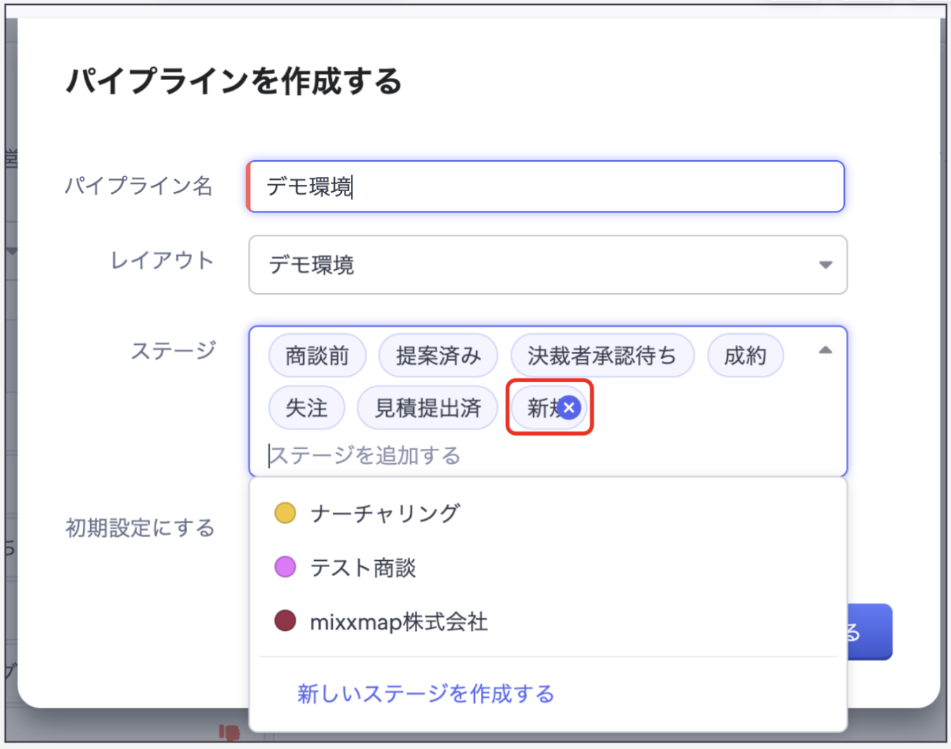 「新しいステージを作成する」をクリックし、各項目を入力して保存します。