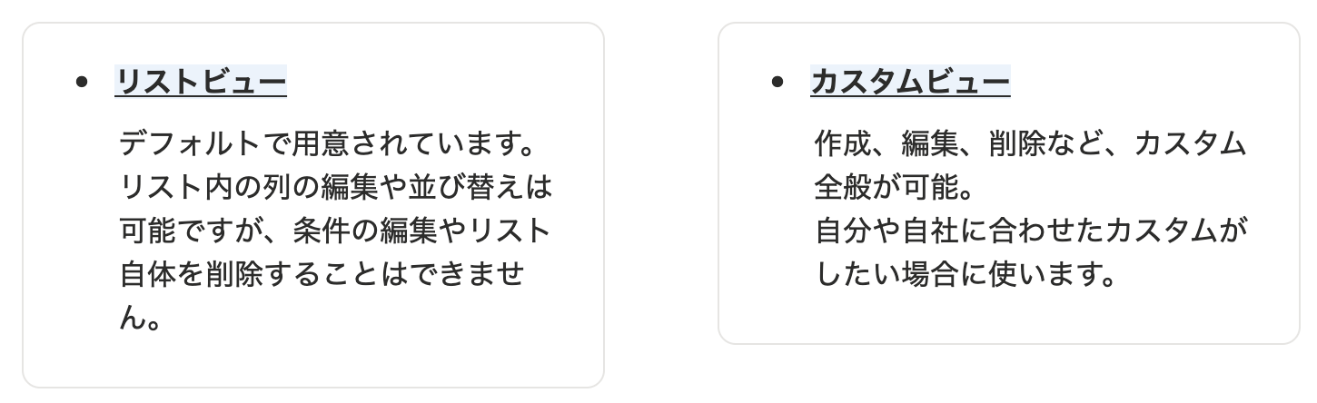 リストビューには、あらかじめ用意されている「リストビュー」と、自分で条件や表示項目を設定できる「カスタムビュー」があります。