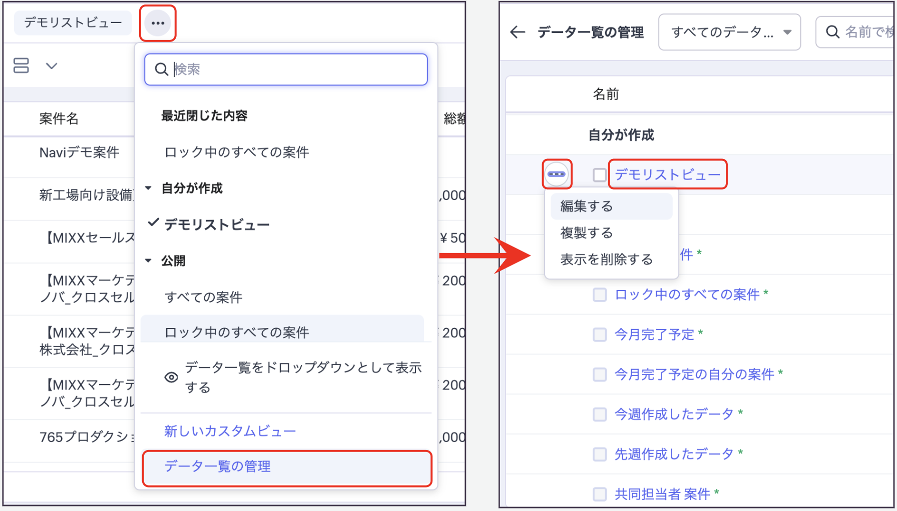 「データ一覧の管理」で、該当ビュー横の「…」または「名前」をクリック