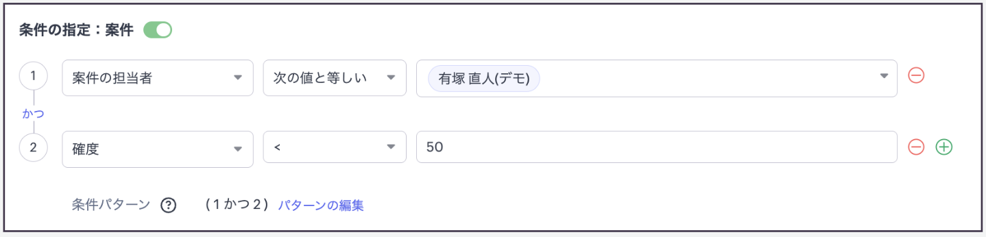 ・右側の「−」「+」ボタンから、条件の追加や削除が可能