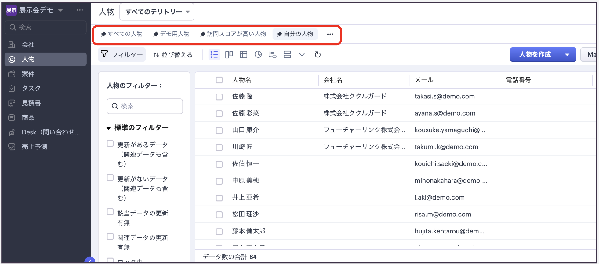 複数の営業担当がいる場合は、担当者ごとのリストビューを作って案件を整理できます。