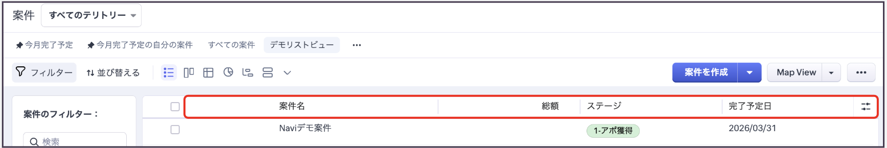 リストビューを活用すると、例えば「今月の商談」や「自分の担当案件」など、条件に合わせて必要なデータだけを表示できるため、日々の確認や営業管理をぐっと楽にすることができます。