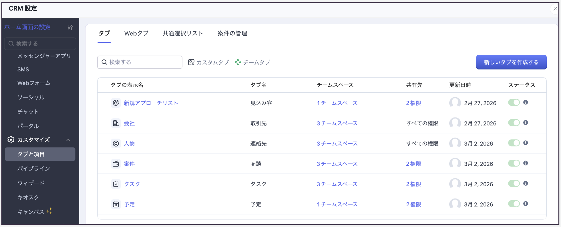 ・[取引先][連絡先][商品]などの全社共通タブでは、組織全体でタブごとに最大20件までレイアウトを作成できます。